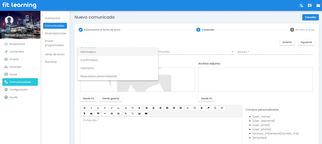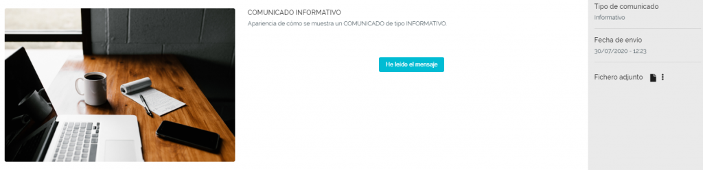 Una comunicación de tipo de envio informativo es aquel que solo tiene la finalidad de informar de su contenido. Se pueden adjuntar ficheros pero la única interacción del usuario con este tipo de envios es confirmar la lectura del comunicado y descargar el fichero adjunto si lo hubiere.