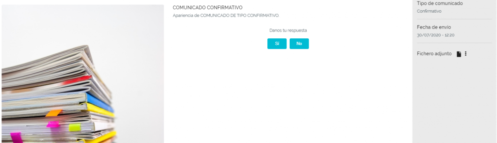 Una comunicación de tipo de envío confirmativo es aquel que tiene como finalidad obtener una respuesta por parte del usuario. Se pueden adjuntar ficheros para su posterior descarga por parte del usuario. Pero la interacción más importante de este tipo de comunicados es enviar un contenido por lo general interrogante para obtener un Si/No por respuesta. Por ejemplo: ¿Acudirás a la reunión convocada?