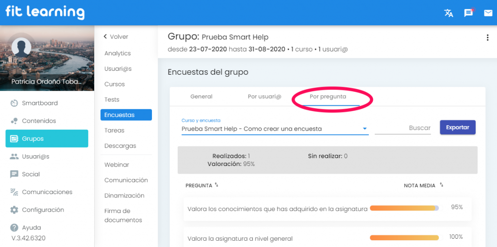 Para visualizar los resultados de una encuesta hace falta que nos situemos en el grupo en el que queremos consultar sus resultados y pinchar sobre el.
