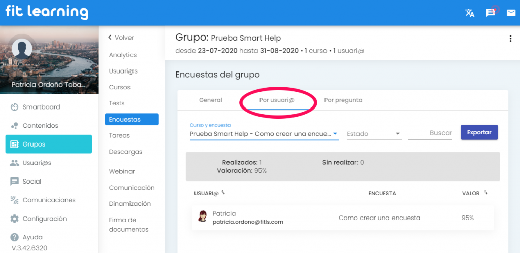En este apartado podemos consultar las encuestas que han sido realizadas por los usuarios, qué encuesta han respondido y qué porcentaje de valoración global han arrojado.