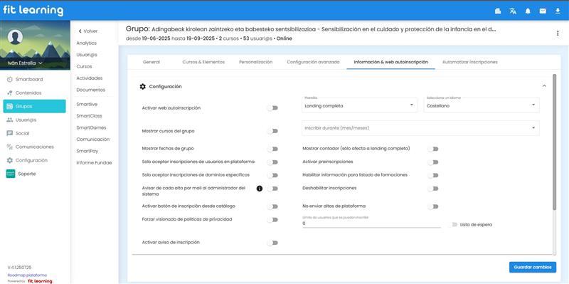 Como primer paso para la creación de la Web, buscamos el GRUPO, lo editamos (Ver Cómo puedo editar un grupo) y vamos directamente a la pestaña WEB AUTOINSCRIPCIÓN.