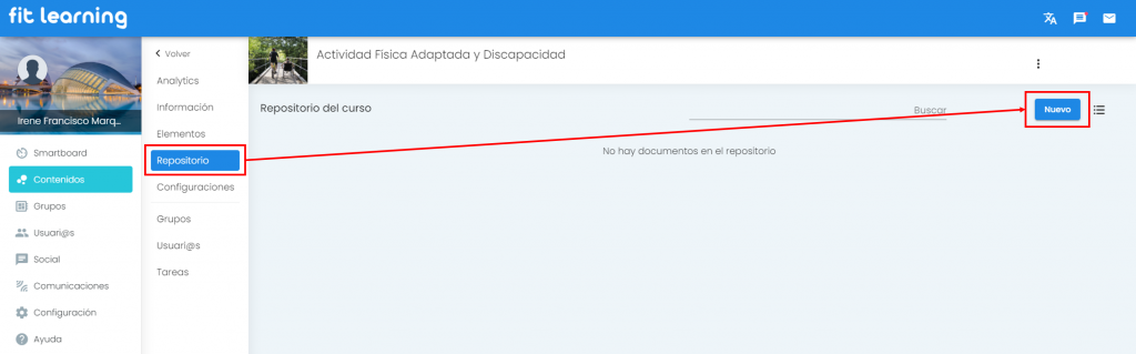 Para subir ficheros a un repositorio, hay que posicionarse en la pestaña “Repositorio” dentro del contenido del curso que interese proceder la subida.