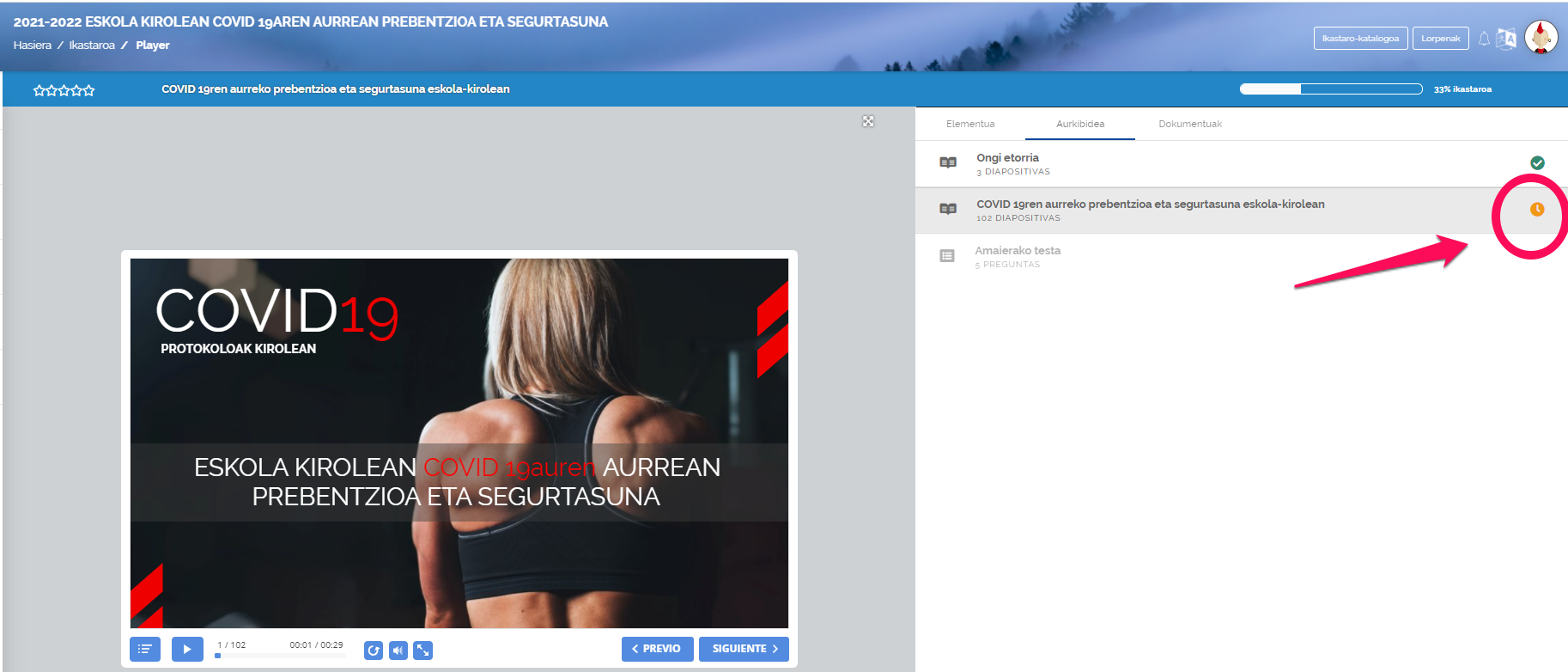 Horrela ez bada, eta osatuta ez badago, berriro sartu beharko duzu ikastaroan, eta edukiak horiz bistaratu edo osatu. Irudiaren adibidea jarraian.