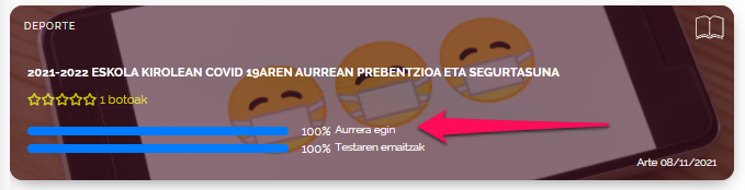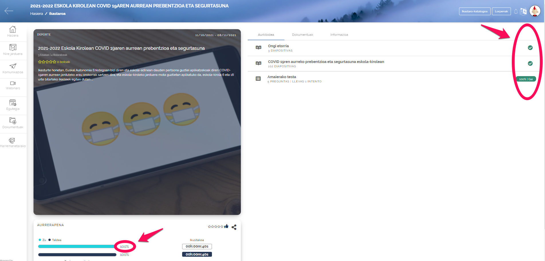 Orduan, zure ikastaroa % 100ean beteta agertuko da ( % 100eko aurrerapena).