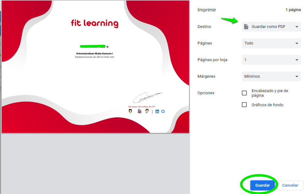 Deskarga-estekan klik egitean, gure diplomara sartuko gara eta gure gailuan gorde ahal izango dugu, PDFa gordetzeko aukerarekin.