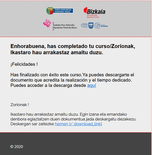 Elementu guztiak berde daudenean, hau da, aurrerapena % 100ekoa denean, ikusitako bideo, ebaluazio, zeregin eta inkesta guztiak amaituta daudenean, eta berdez, baldin badaude, une horretan, plataformak mezu elektroniko bat bidaltzen du izena emateko erabili dugun helbide elektronikora, eta bertan gure diplomarako esteka bat sartzen da.