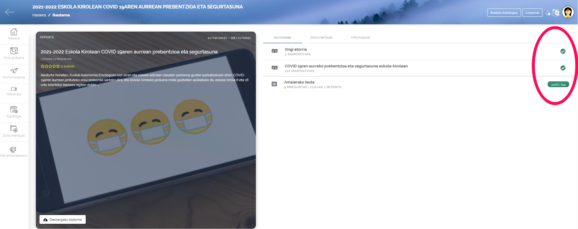 Elementu guztiek (bideoak, ebaluazioak, inkestak, etab.) berdez agertu behar dute. Irudiak erakusten duen bezala.