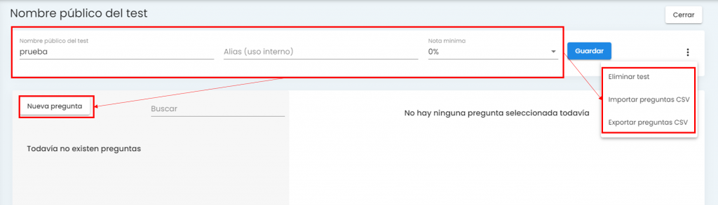 - Botón exportar preguntas: a la derecha del botón guardar se encuentra un menú desplegable, ahi encontrará el botón exportador de preguntas para poder exportar las preguntas del test.