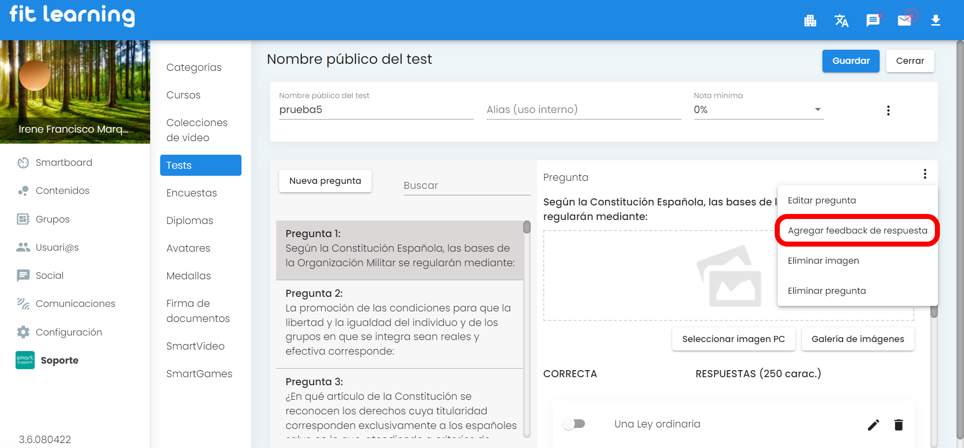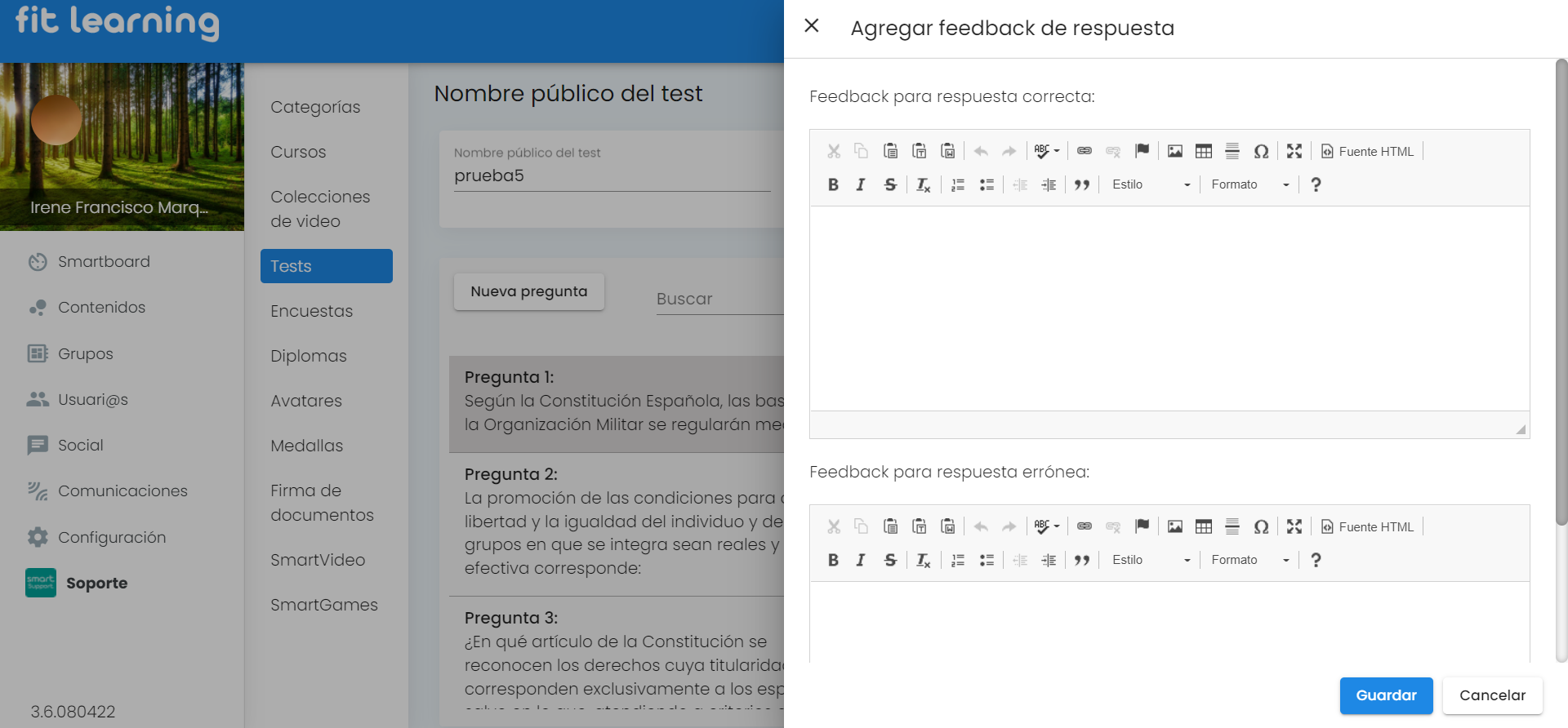 Ahora puedes añadir una respuesta de feedback, esto es la respuesta que recibirá el usuario cuando marque la respuesta correcta o incorrecta.