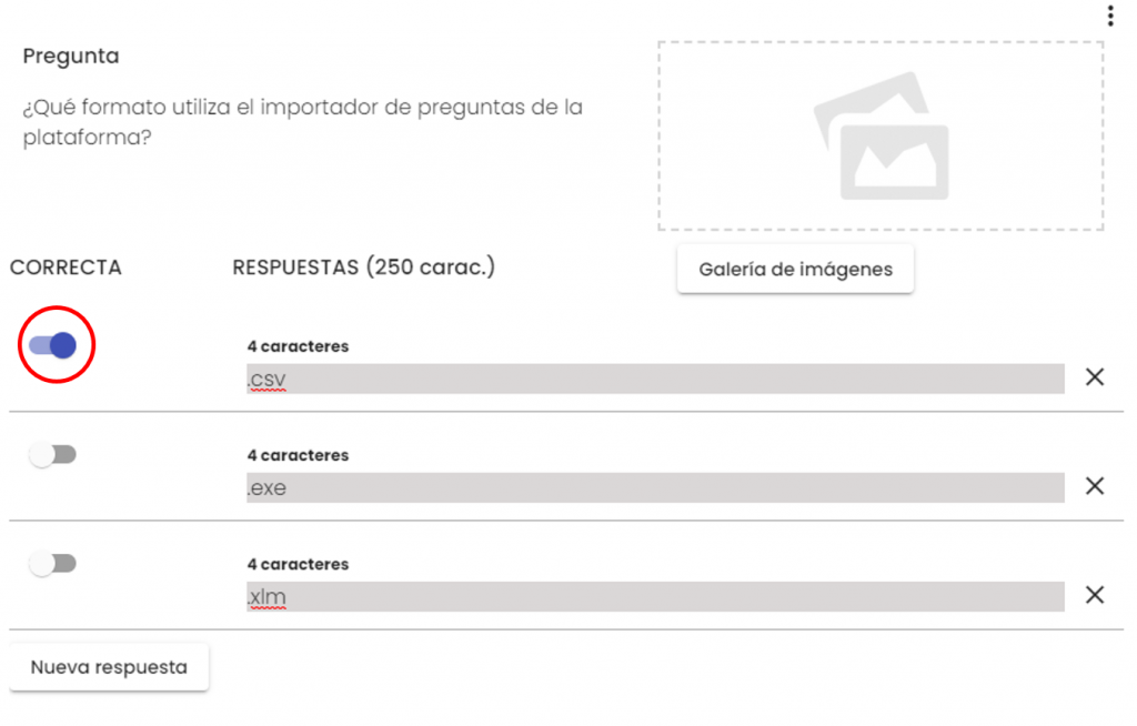 Para indicar la respuesta correcta hace falta seleccionarlo mediante el botón circular que precede a todos los textos de las respuestas. Si se marcan varias respuestas como correctar, el alumno tendrá que marcar todas las correctar para pasar.