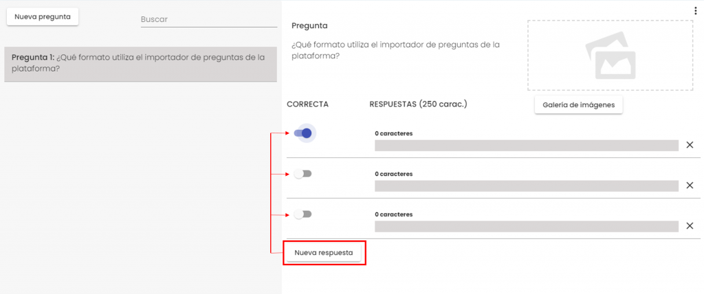 Cuando la pregunta esté cargada en el editor, es hora de crear la respuesta a dicha pregunta. Para ello pulsando en el botón “Nueva respuesta” las veces como respuestas se desean aparecerán cajas de texto donde añadir las respuestas.