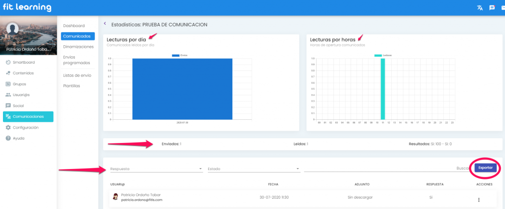 - Lecturas por día: Al enviar a varios alumnos de un curso, nos muestra que día han ido abriendo el comunicado que le hemos enviado.