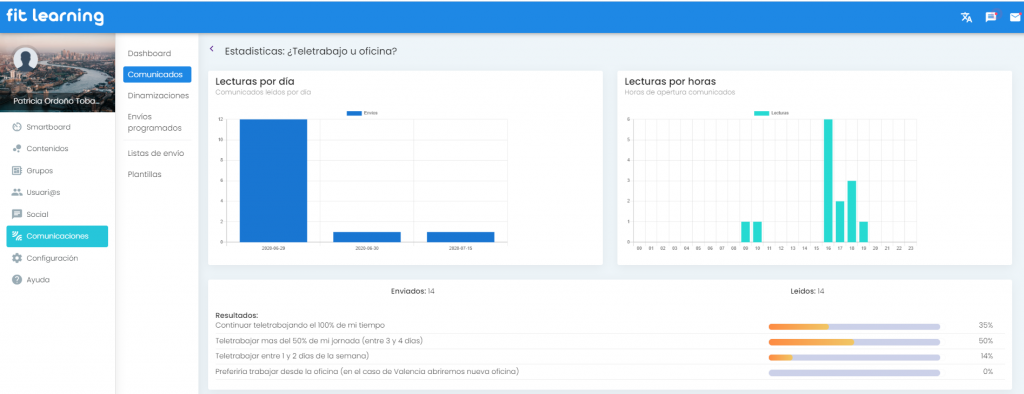 - Lecturas por hora: Muestra las horas en las que han abierto los comunicados